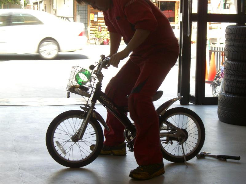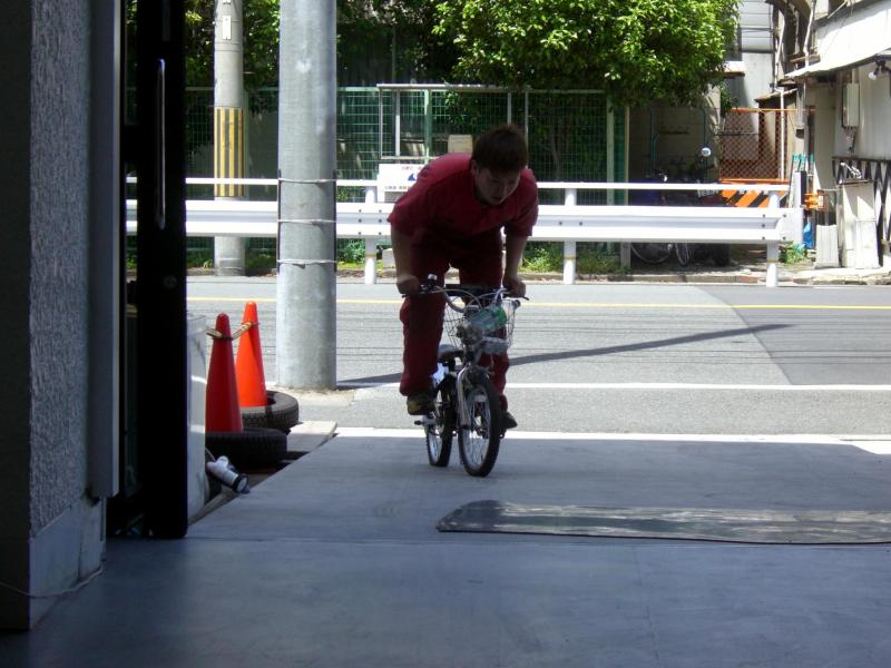 子供用自転車を本気で漕ぐ店長